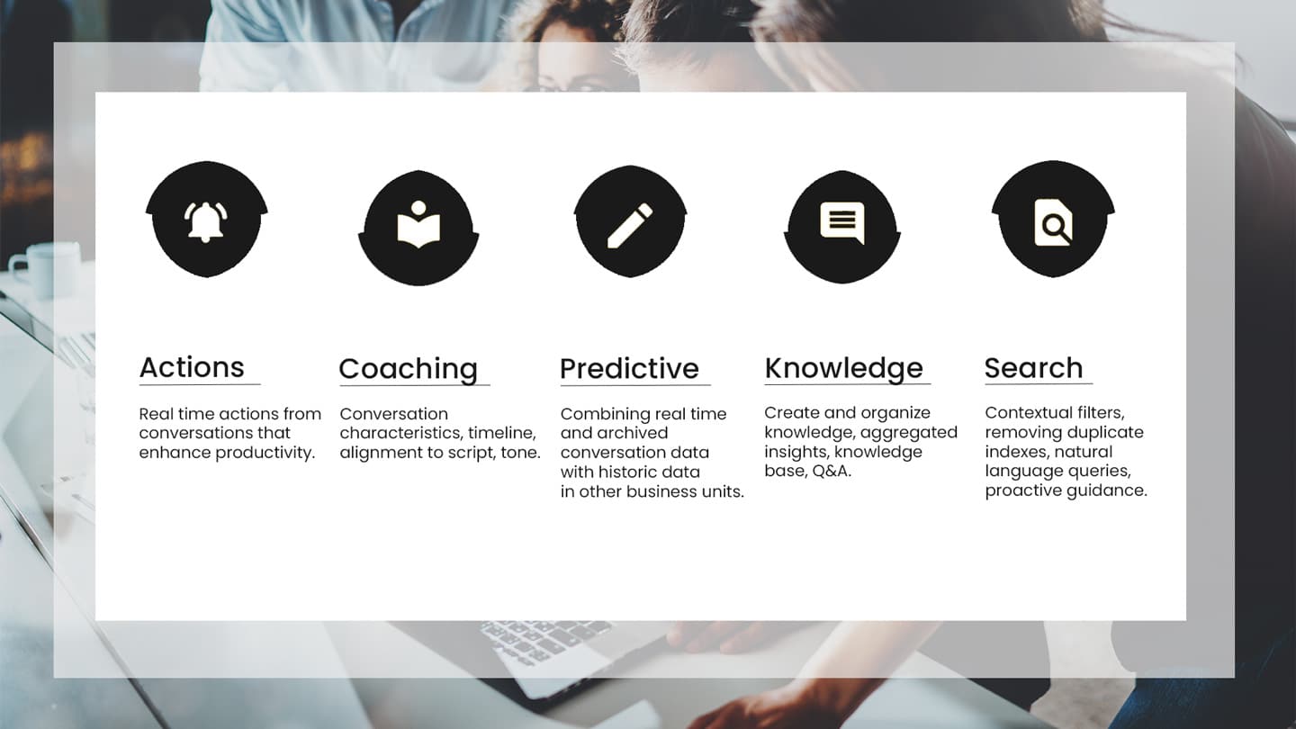 There are five main ways in which conversation intelligence (CI) is currently being used or envisaged: real-time action, coaching, predictive analysis, knowledge, and search. All of these aspects of the CI landscape will come together to make humans smarter and more efficient, with little effort on the user’s part other than continuing to undertake natural conversations.