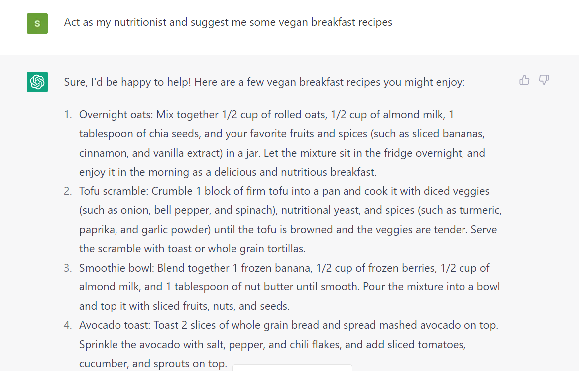 2. Act as my nutritionist and give me vegan breakfast recipe suggestions.