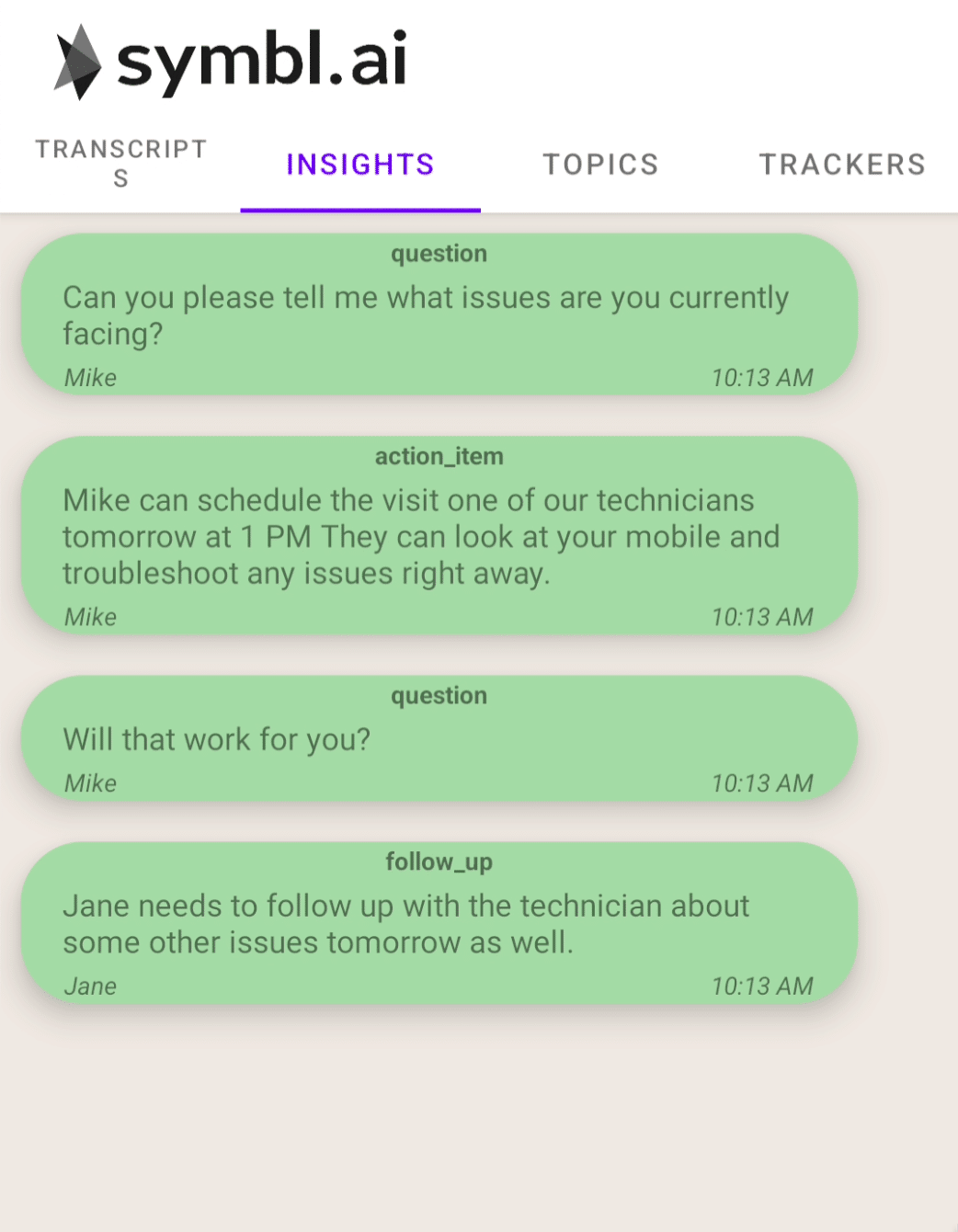 The next tab is Insights. Insights contain questions, action-items, and follow-ups, captured during the call.