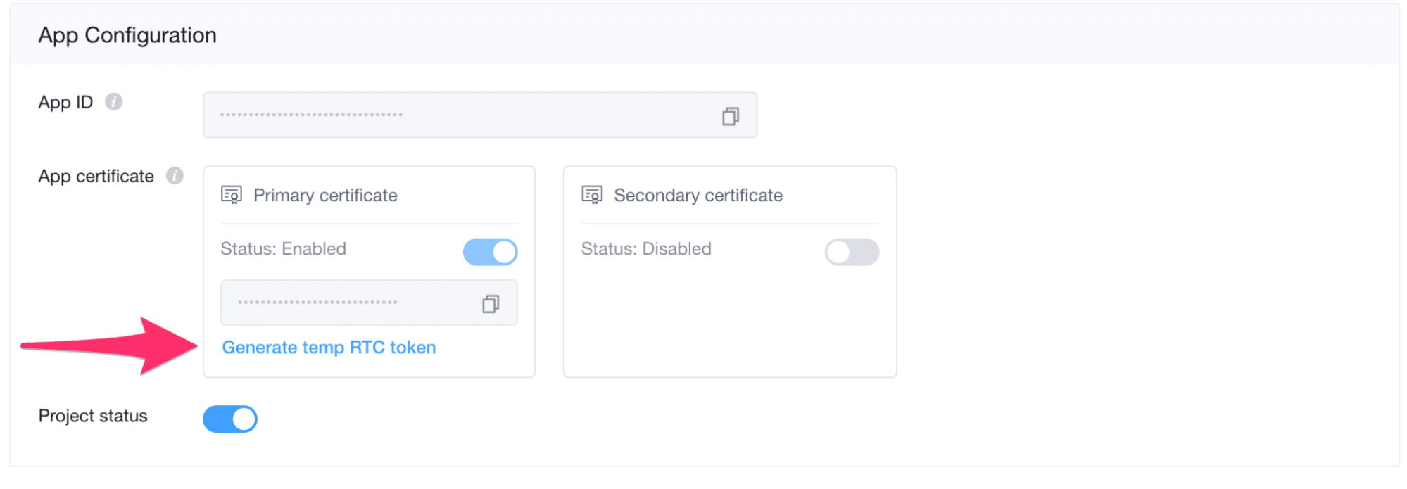 3. Turn the Primary Certificate toggle on and click the Generate temp RTC token button.
