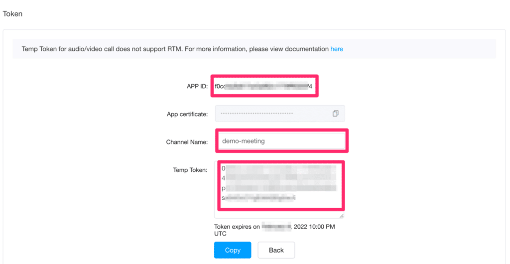 4. Provide a Channel Name and click the Generate Temp Token button. Copy the APP ID, Channel Name and Temp Token