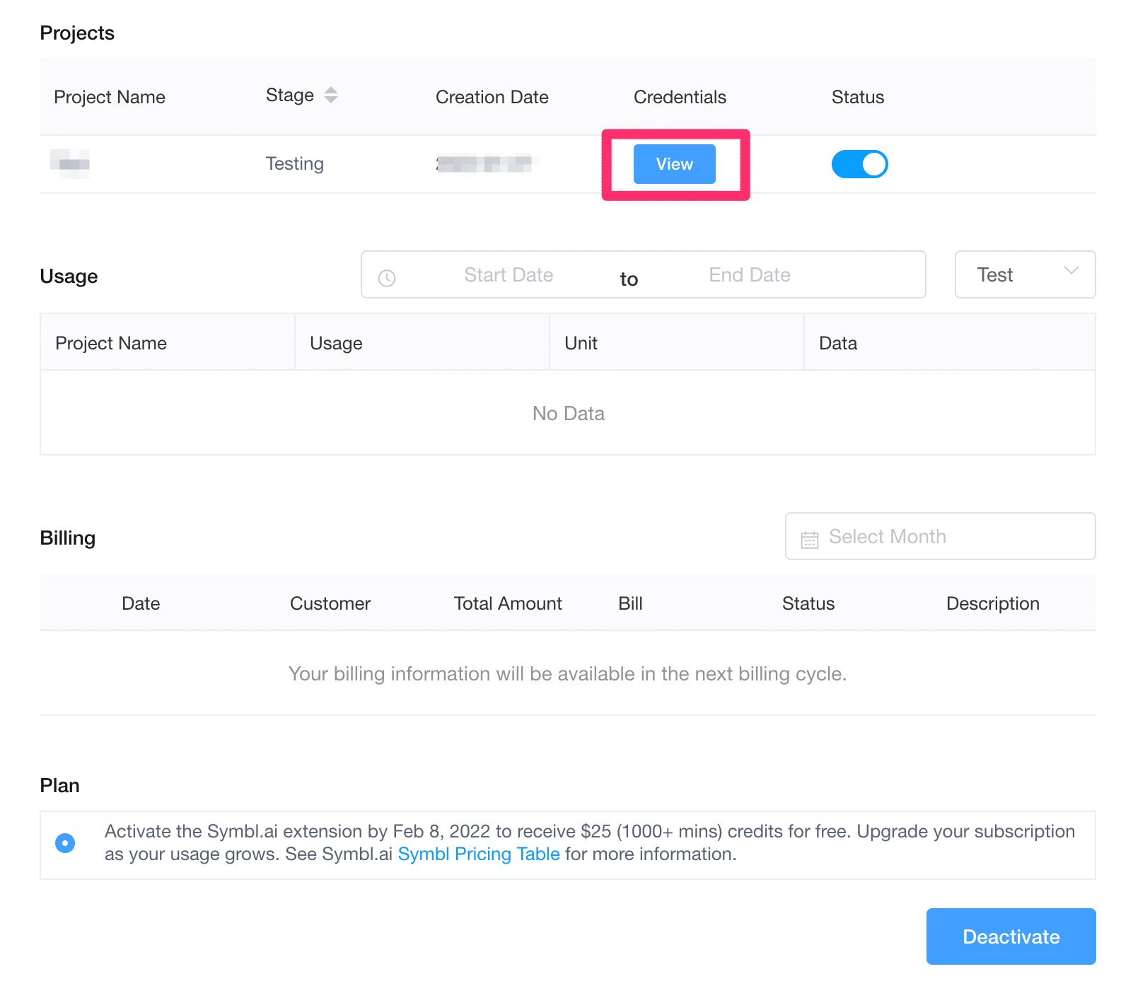 6. Scroll down and click the Activate button to activate the extension and retrieve the required Symbl.ai credentials.