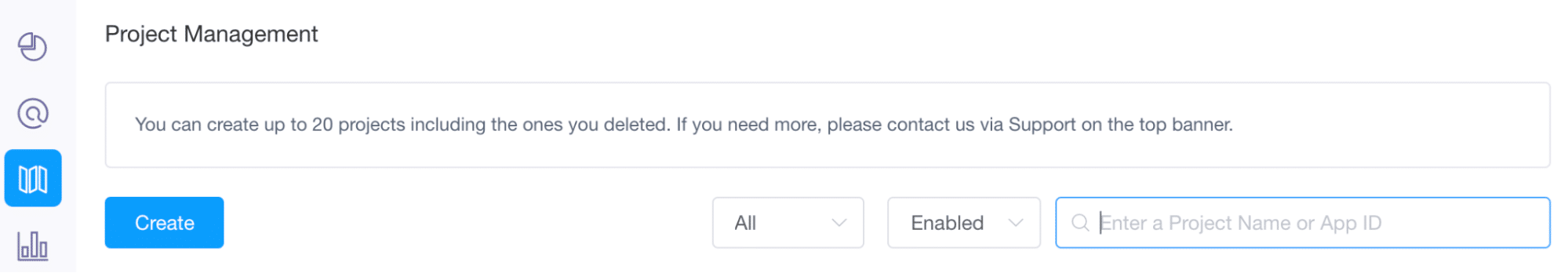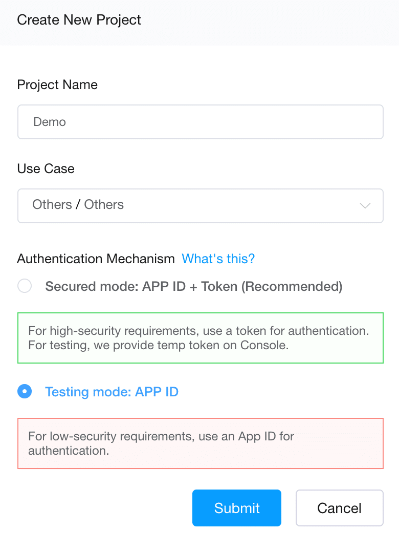 1. Navigate to Agora.io’s console where you can sign up for a free developer account. Create a new project by clicking on the the Create button under Project Management.