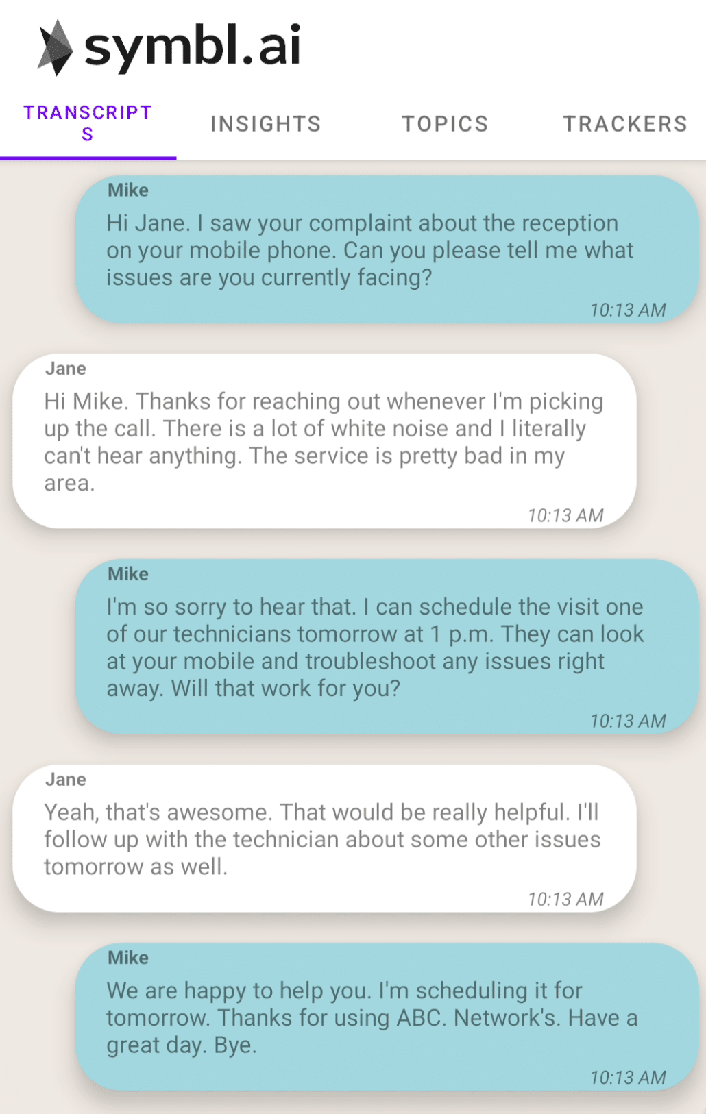 If you would like to see the other Symbl.ai Conversation Intelligence capabilities added to this sample mobile app that go beyond live captioning, swipe right. On that screen you see a tab view controller. The first tab shows the meeting Transcripts.