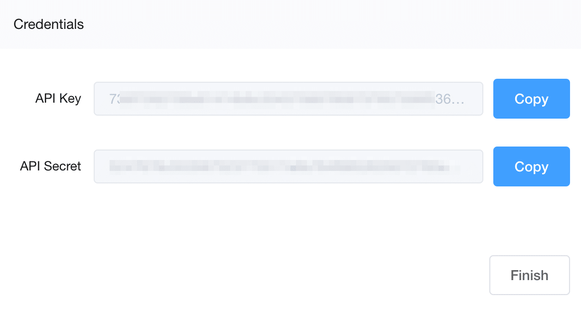Copy the API Key and API Secret values and then click Finish. You are going to update the sample mobile app configuration with the symbl_app_id (API Key) and the symbl_app_secret (API Secret) values below.