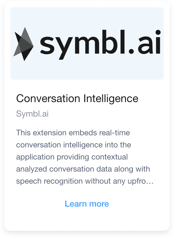 5. After setting up your project, head over to the Extensions Marketplace and select the Symbl.ai Conversation Intelligence card.