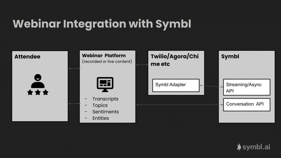 Building all these capabilities from scratch is a time-consuming task. With Symbl.ai’s flexible API, you can skip hours of being hunched over your keyboard training machine learning models to understand context and recognize speech. Depending on the platform you can use the Symbl.ai Adaptor and then unleash Symbl.ai on the recorded file after the webinar with the Async API, or have it work in real-time with the Streaming API. Here’s what the integration of Symbl.ai’s conversation intelligence API with a webinar looks like: