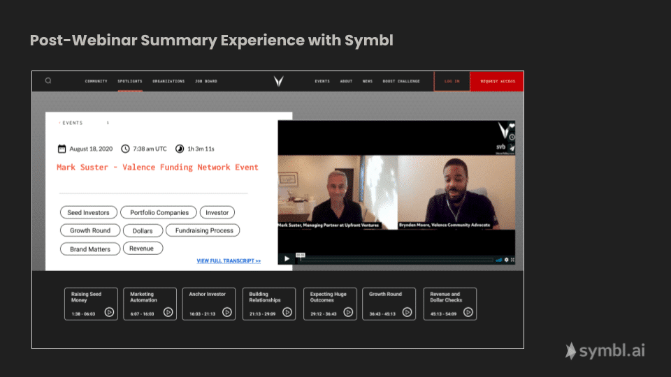 - Customize a pre-built webinar summary UI for easy content navigation. Using Symbl’s Video Summary UI, you can provide a screen where users can select key elements like topics, transcripts, and insights. The interface will surface the timestamp where it occurred and begin playback from there. The image below illustrates Symbl.ai’s Video Summary UI for a webinar in action.