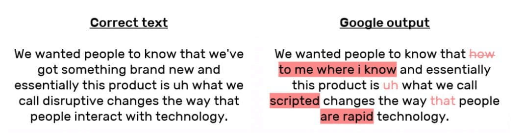 Once you’ve used ASR to capture the sample text, you can compare it to the original. Color highlighted text provides you with a visual representation of the accuracy. It helps you see whether or not your ASR is understanding what is being said at glance, rather than having to analyze WER.