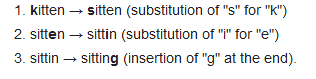 For example, the Levenshtein distance between bird and bard is one. The difference between kitten to sitting would be three because you’d have to make three substitutions to get there.