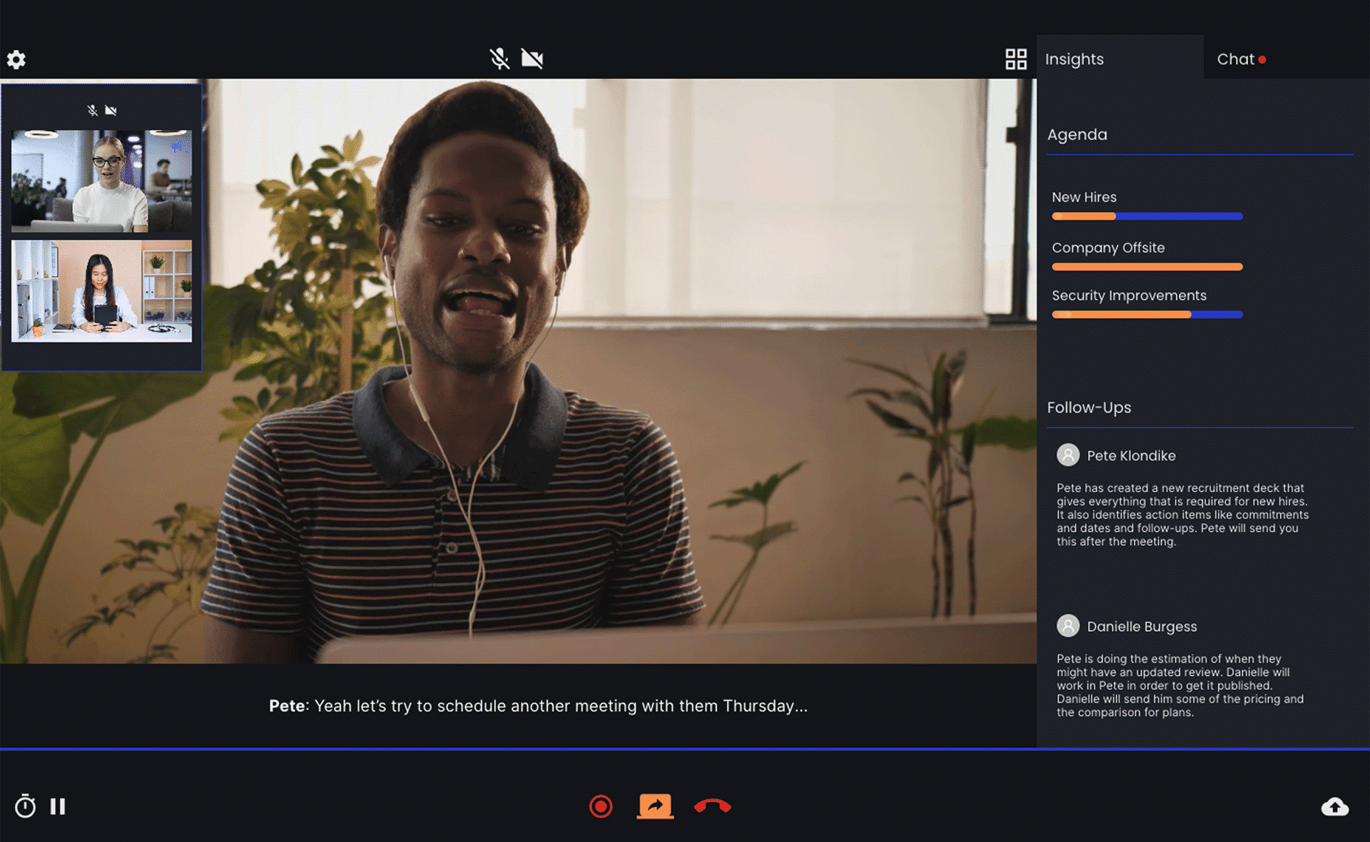 Symbl.ai enhanced video experience displaying live captioning, follow ups, and custom trackers.