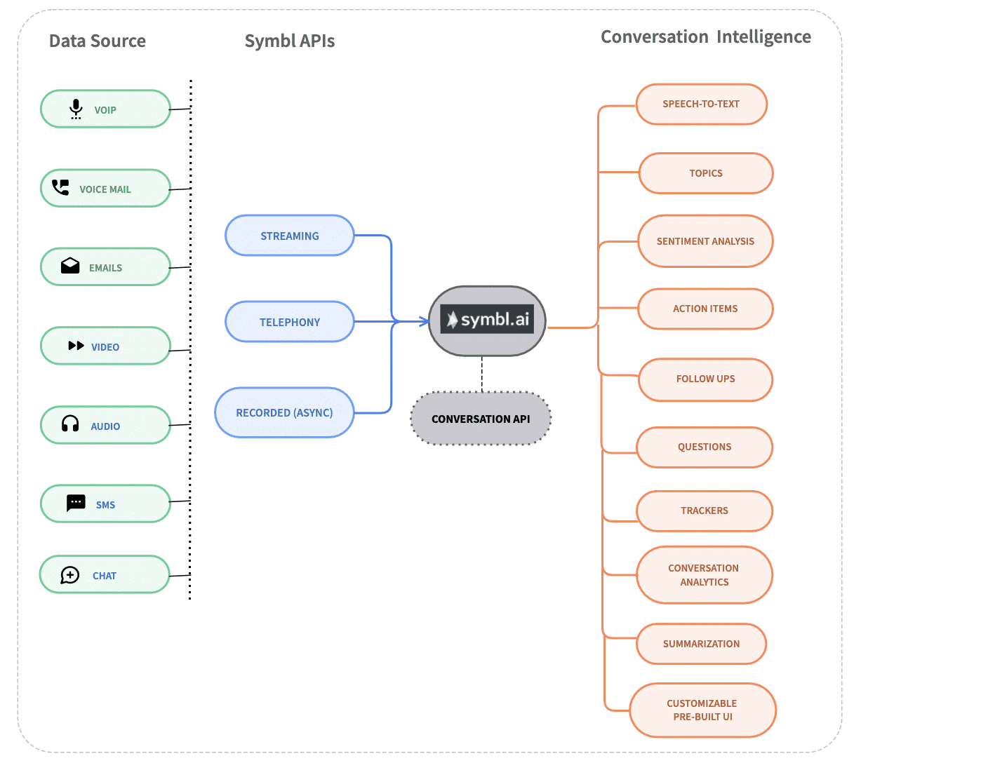 Conversation intelligence uses AI to analyze text or speech to gain insights into calls. You can integrate Symbl.ai into your video or audio applications without having to build the complex machine learning models typically required for AI.