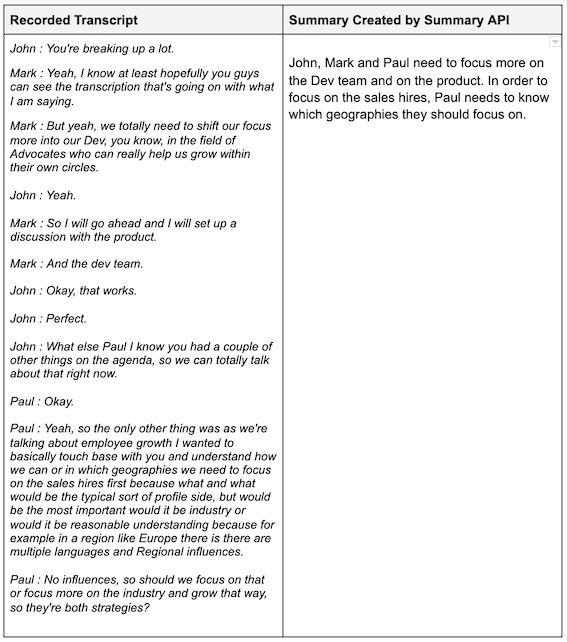 One of Symbl.ai’s features that’s really useful for long form voice/video content is the Summary API. With this API you can create summaries of your long form content in real time or after it has ended. Using Summary API, you can create summaries that are succinct and context-based. Here’s an example of a summary generated by Symbl.ai from a recorded transcript: