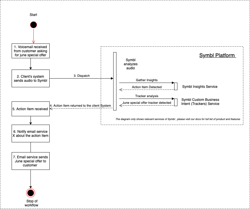 For example, if a customer leaves a voicemail asking about a specific deal you’re offering, you can use the Symbl.ai API Trackers feature to create a workflow that sends an automatic reply to the customer with the right information. The workflow in this example would look like this: