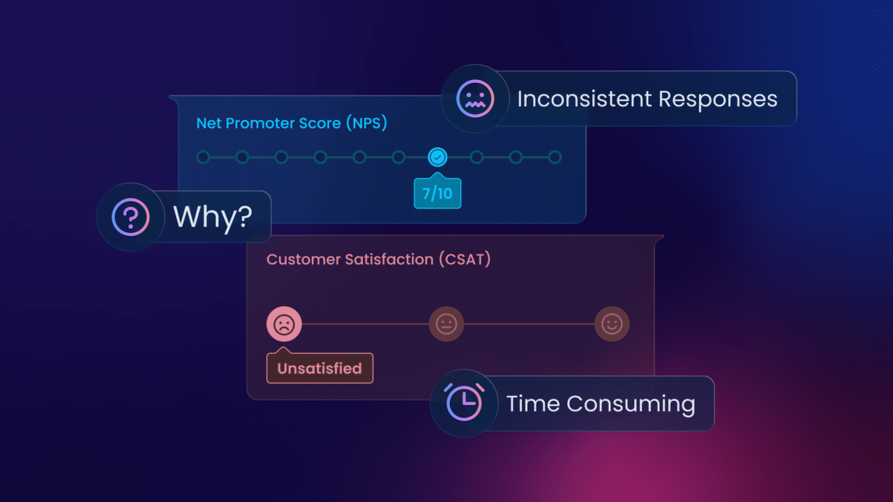 Inconsistent Responses: Besides customers not providing responses in the survey, the surveys are incomplete and they might not always provide accurate or honest CSAT and NPS scores. Factors like mood, time constraints, and the phrasing of the survey questions can influence their responses, leading to skewed scores that don’t accurately reflect their true sentiments.