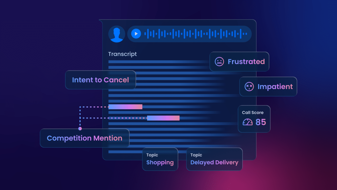 A customer contacts a subscription-based company’s customer support regarding a delayed order delivery. Traditionally, the representative would address the issue, inquire about satisfaction, and conclude the call. The NPS or CSAT scores for these calls are analyzed periodically and this post-call analysis might identify a lower CSAT/NPS score which makes the customer likely to churn. On the contrary, conversation insights are collected for every interaction and provide more nuanced insights, context behind the insights such as the intent and unsaid emotions hidden between the lines which helps businesses tailor customer interactions. Conversation insights includes keywords pre-set by businesses such as competitor mentions and sentiment analysis which provides early dissatisfaction signs even before the customer provides a low CSAT/NPS scores. This dynamic analysis enables the generation of churn signals while the conversation is still ongoing leading personalized retention strategies.