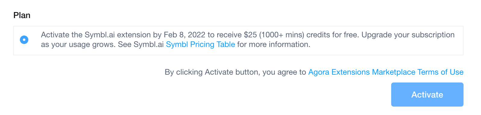 6. Scroll down and click the Activate button to activate the extension and retrieve the required Symbl.ai credentials.
